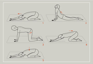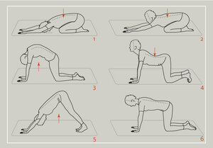 - Gehen Sie beim Ausatmen in den Vierfüßlerstand und machen einen Katzenbuckel.