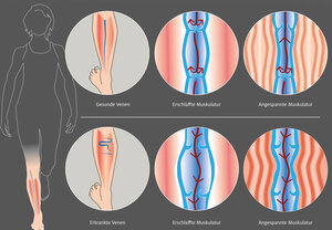 Kann in den Beinen die Wadenmuskelpumpe den Abtransport des Blutes nicht mehr zufriedenstellend unterstützen, dehnen sich den Venen aus und die Venenklappen funktionieren nicht mehr. Ergebnis sind schwere und müde Beine, Schwellungen sowie ggf. das Einschneiden von Socken oder Schuhen ins Gewebe. Dies sind eindeutige Anzeichen. Mit der Zeit können Besenreiser, Krampfadern oder ein „offenes“ Bein die Folge sein.